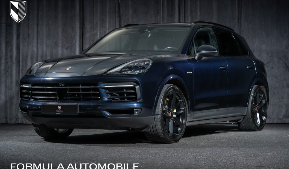 Nydelig Porsche Cayenne E-Hybrid i vakre Moonlight Blue Metallic med sort interiør til salgs.